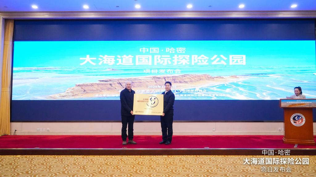 中国探险协会主席韩勃(左)向哈密市人民政府副市长胡冬明颁发大海道国际探险公园牌匾。(主办方供图)