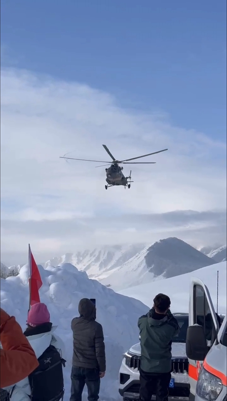 1月14日上午,新疆军区某陆航旅任务机组装载燃油、发电机、米面油等物资,和部分救援人员一起飞赴阿勒泰地区喀纳斯点位进行投送。到达点位后,工作人员迅速卸载物资,部分因暴雪天气被困的群众登机,由喀纳斯游客中心转运至喀纳斯机场。