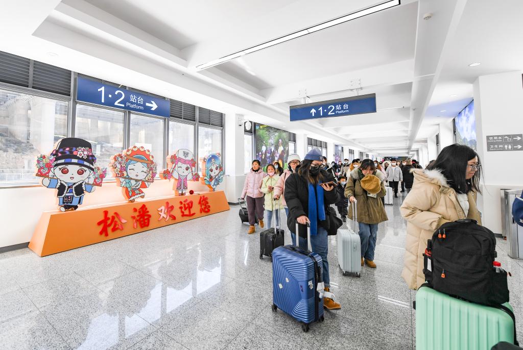 在川青铁路镇江关站,前来游玩的游客陆续出站。新华社记者王曦 摄