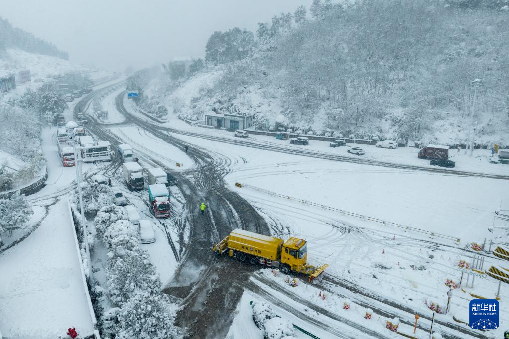 1月22日,在湖南省娄底市一高速收费站,除雪车在作业(无人机照片)。近日,受寒潮天气影响,我国多地迎来降温降雪天气,各地积极组织相关部门开展抗凝除雪工作,保安全保畅通。新华社发(吴永华摄)
