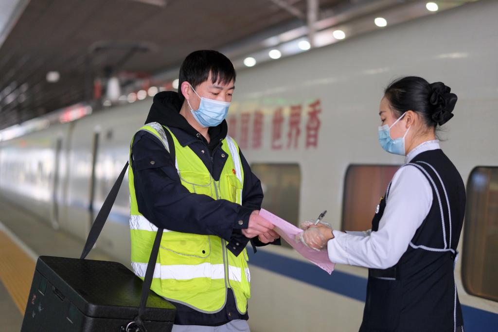 高铁“外卖员”向坤正在与列车服务员做餐食交接登记工作。新华社发(王圣凯摄)