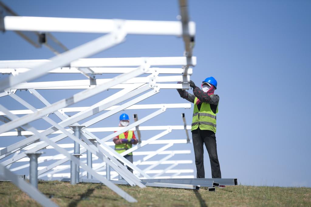 2022年6月8日,在青海省海南藏族自治州共和县,工人在黄河上游水电开发有限责任公司海南基地共和县100万千瓦光伏项目施工。新华社记者 张龙 摄