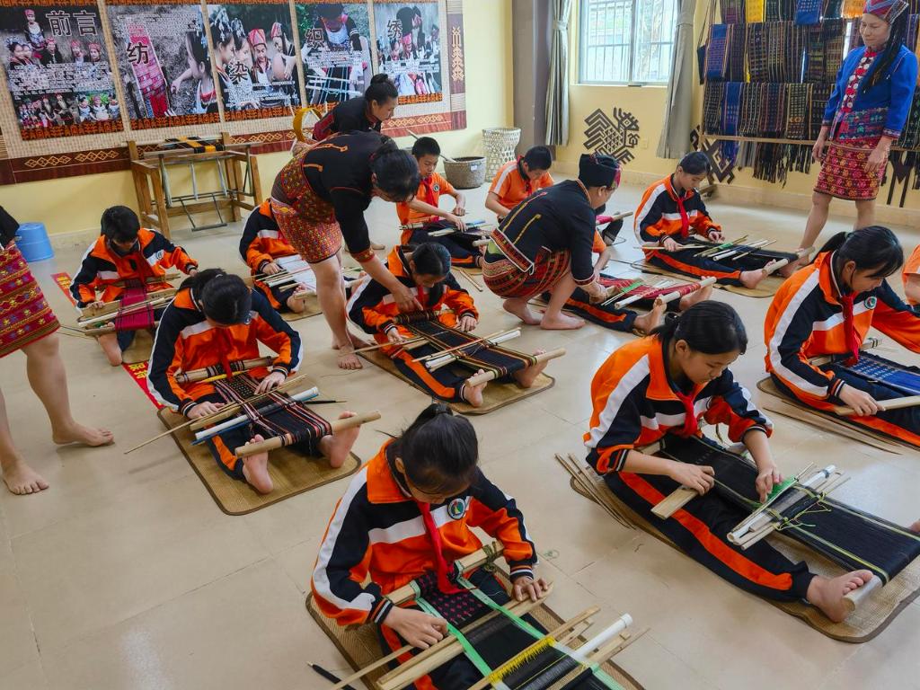 黎族纺染织秀技艺传承人在指导学生们织锦。新华每日电讯记者 赵叶萍 摄