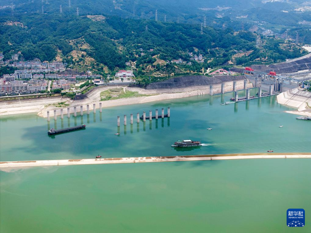 6月6日在湖北省宜昌市秭归县拍摄的水位下降后的三峡大坝(无人机照片)。新华社发(郑家裕摄)