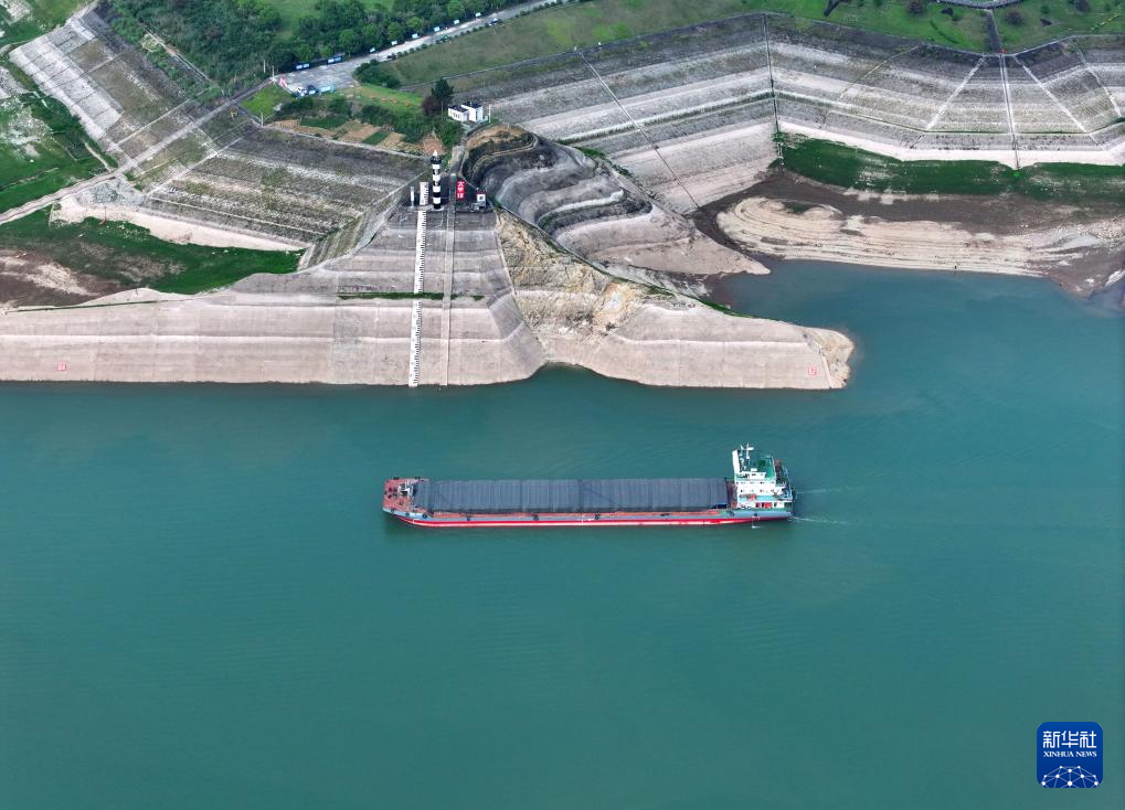 6月6日,船舶从水位下降后的湖北省宜昌市太平溪水文标尺前驶过(无人机照片)。新华社发(王罡摄)