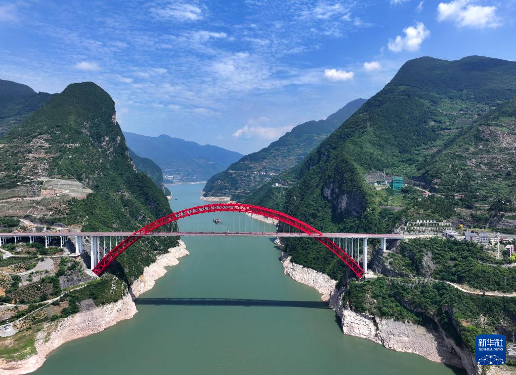 6月6日,船舶行驶在水位下降后的湖北省宜昌市秭归县兵书宝剑峡水域(无人机照片)。新华社发(王罡摄)