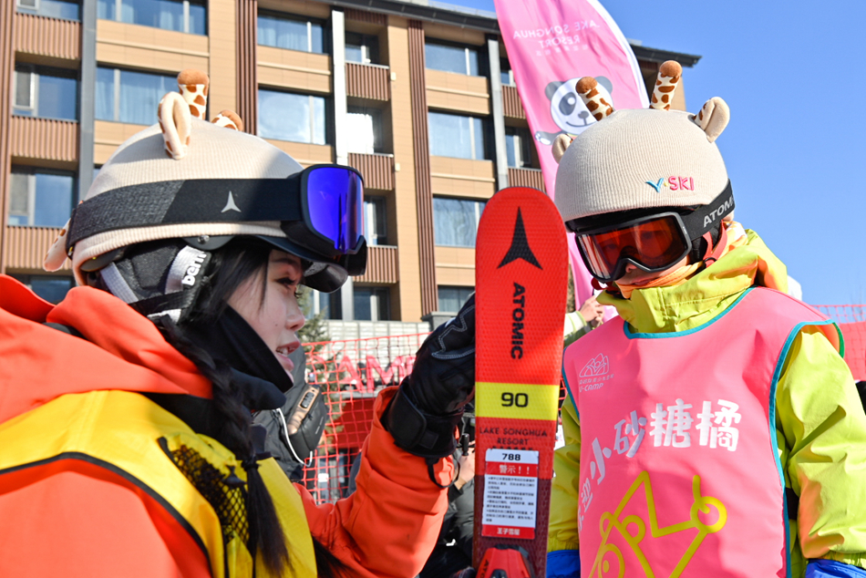 1月8日,滑雪教练在吉林市万科松花湖度假区向来自广西南宁的“砂糖橘”小朋友讲解滑雪知识。新华社记者 颜麟蕴 摄