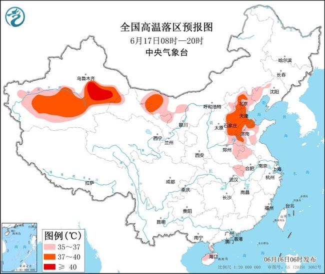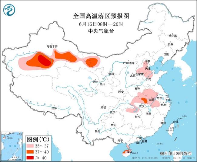 中央气象台6月16日06时继续发布高温黄色预警:今天(6月16日),华北、黄淮等地高温强度将有所减弱、范围将有所减小,但预计今天白天,内蒙古西北部、新疆南疆盆地和东部、甘肃河西、河北中部、北京、山东西北部、河南东部和南部、安徽、湖北东北部、海南岛北部等地仍有35~36℃高温天气,其中,内蒙古西北部、新疆南疆盆地和东部、河南东南部等地部分地区最高气温37~39℃,新疆南疆盆地局地可达40℃以上。