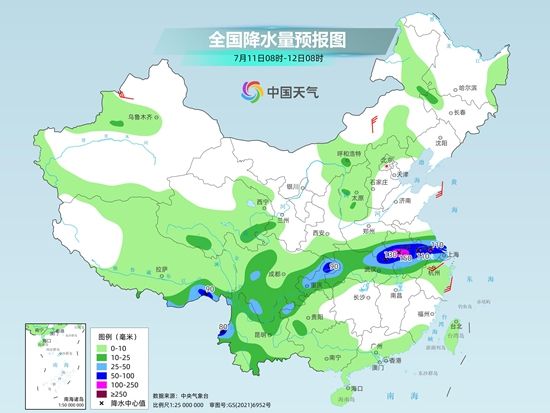 未来三天,四川盆地有低涡发展,淮河沿线附近有切变线发展,强降雨将继续维持在四川盆地到淮河流域一带。其中,今天四川盆地、重庆北部、陕西东南部、湖北西部和北部、河南东南部、安徽中部、江苏中南部等地有大到暴雨,四川盆地东北部、江苏西南部等地局地有大暴雨。