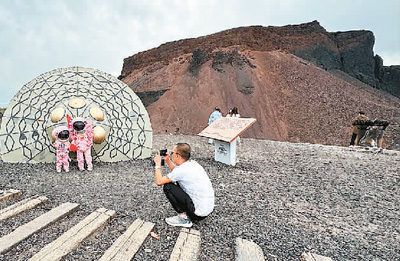 两名身穿宇航服的儿童在乌兰哈达火山拍照。本报记者 尹 婕摄