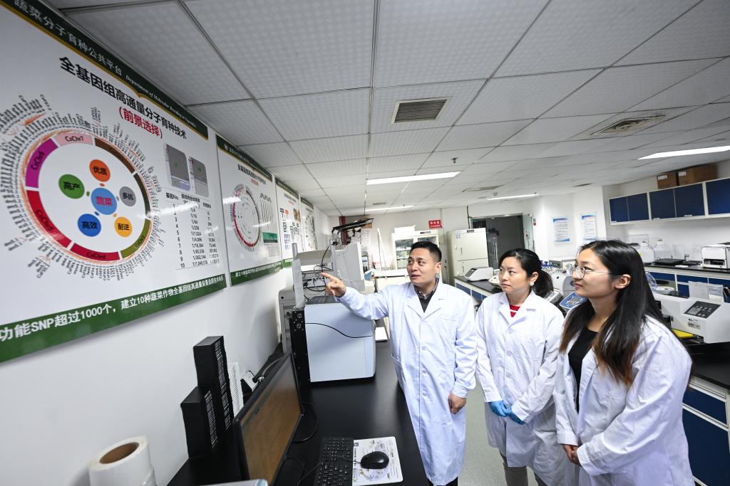 温常龙(左一)在实验室讲解分子育种技术。受访者供图