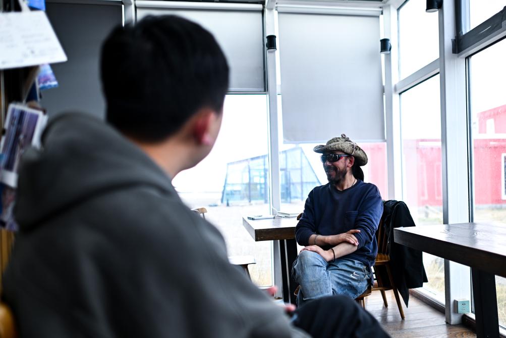 5月25日,在长江1号邮局,吐旦旦巴(右)与访客分享自己保护江源的故事。新华社记者 张龙 摄
