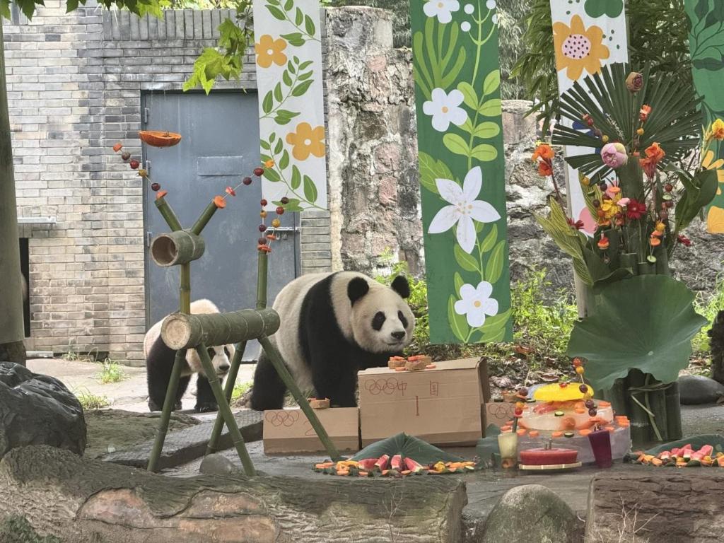 被捆扎成“大蛋糕”造型的新鲜竹笋、水果拼盘……今年8月,在中国大熊猫保护研究中心都江堰基地,年满33岁的老龄大熊猫“白云”享用到中心工作人员精心准备的生日美食。