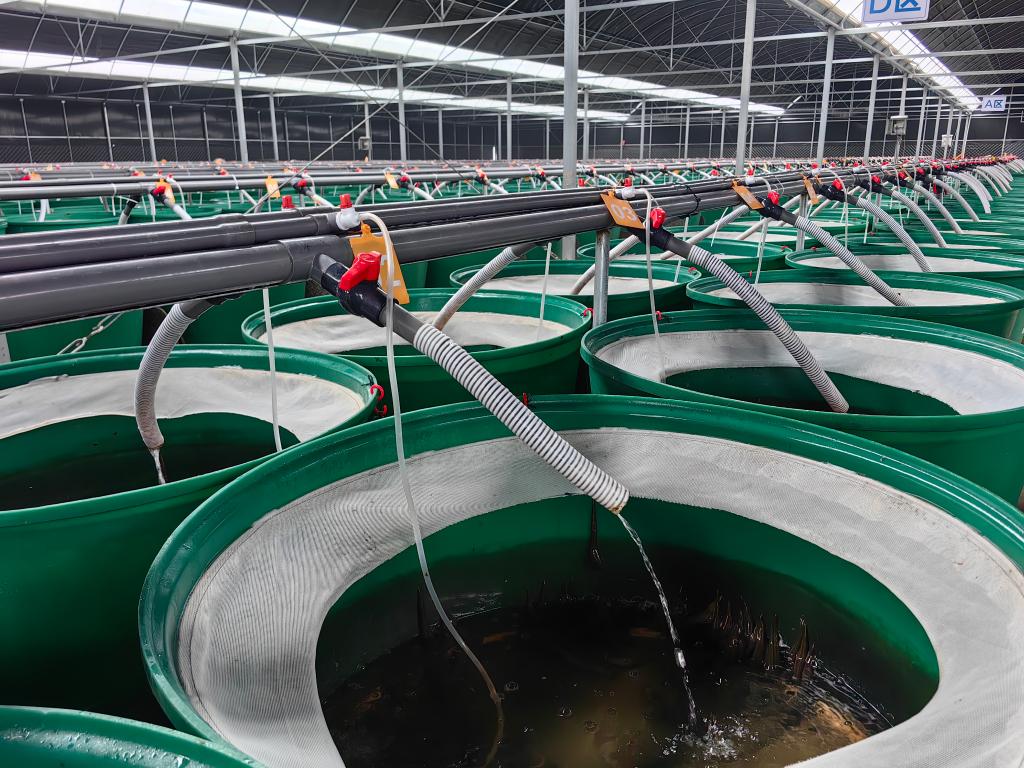 在微山湖现代渔业产业园的智慧渔业车间,几十个大圆筒状的养殖池里,鳗鱼、加州鲈等游来游去。