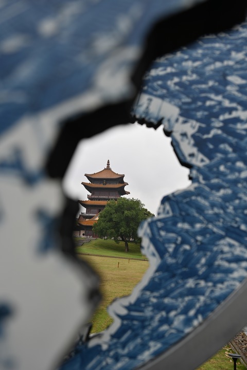 2024年6月5日,在江西景德镇透过创意青花瓷盘拍摄的龙珠阁。新华社记者 刘力航 摄