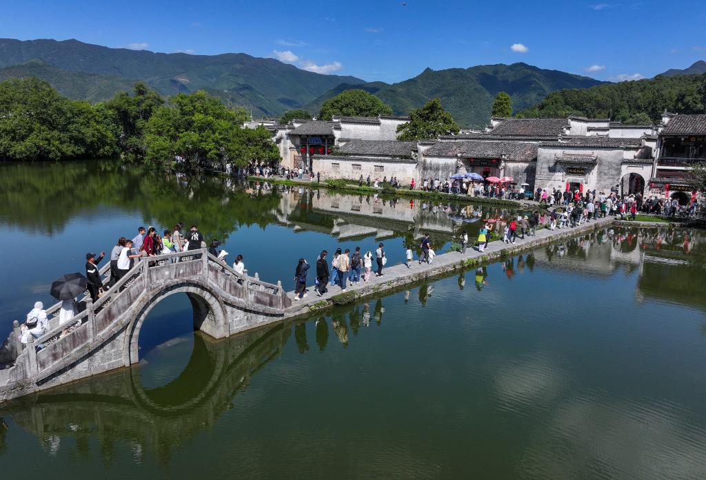 游客在黄山市黟县宏村游玩(10月3日摄,无人机照片)。