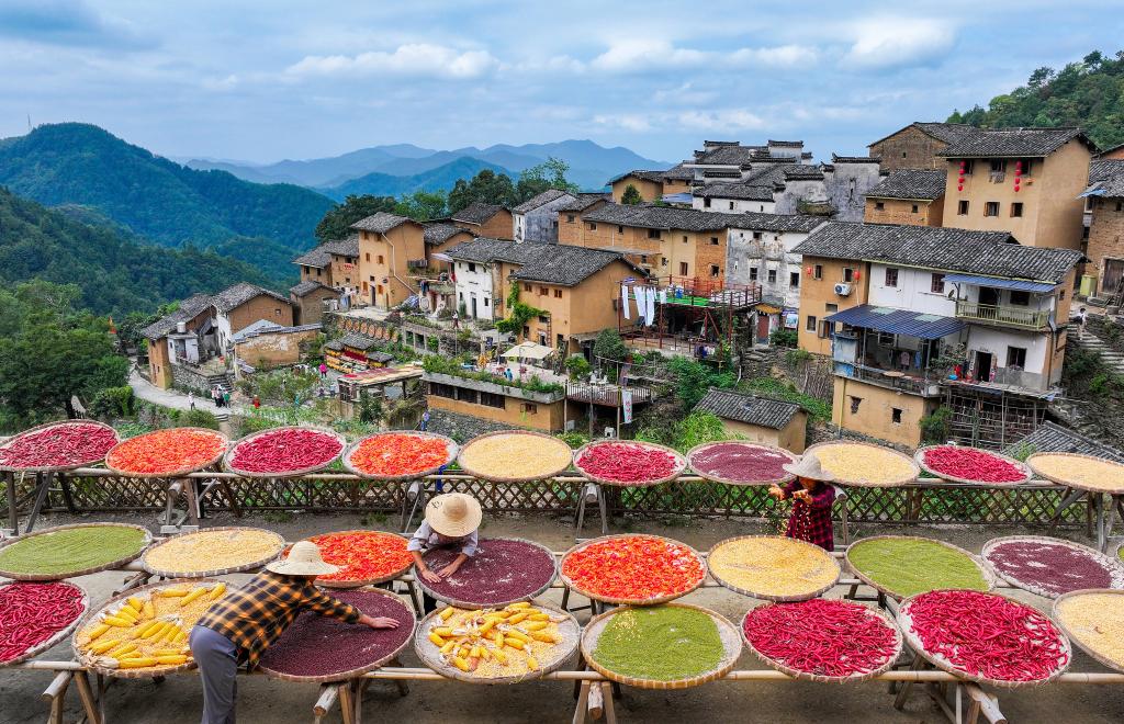 黄山市歙县阳产村,村民在土楼前晾晒农作物(9月22日摄)。