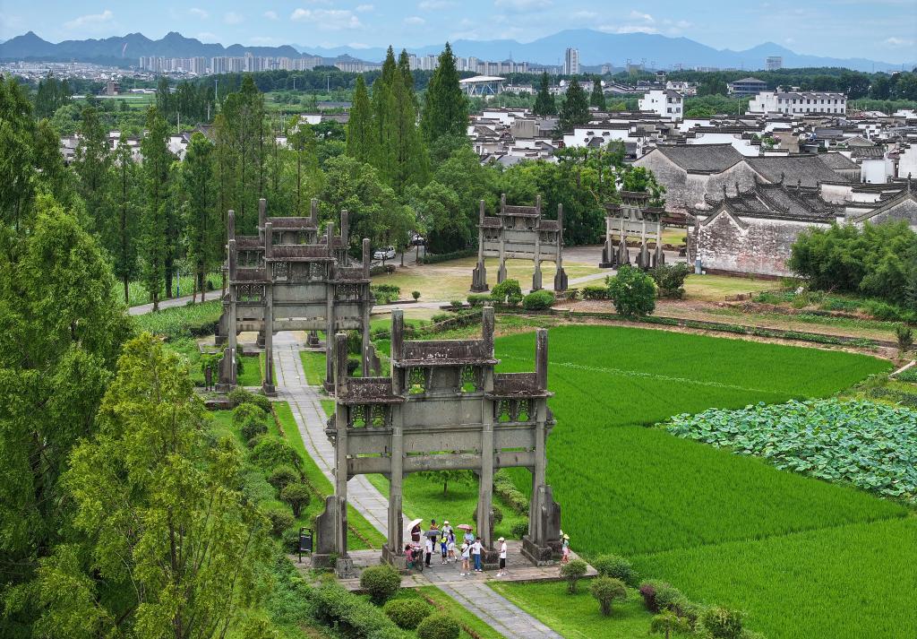 黄山市歙县棠樾牌坊群(7月20日摄,无人机照片)。