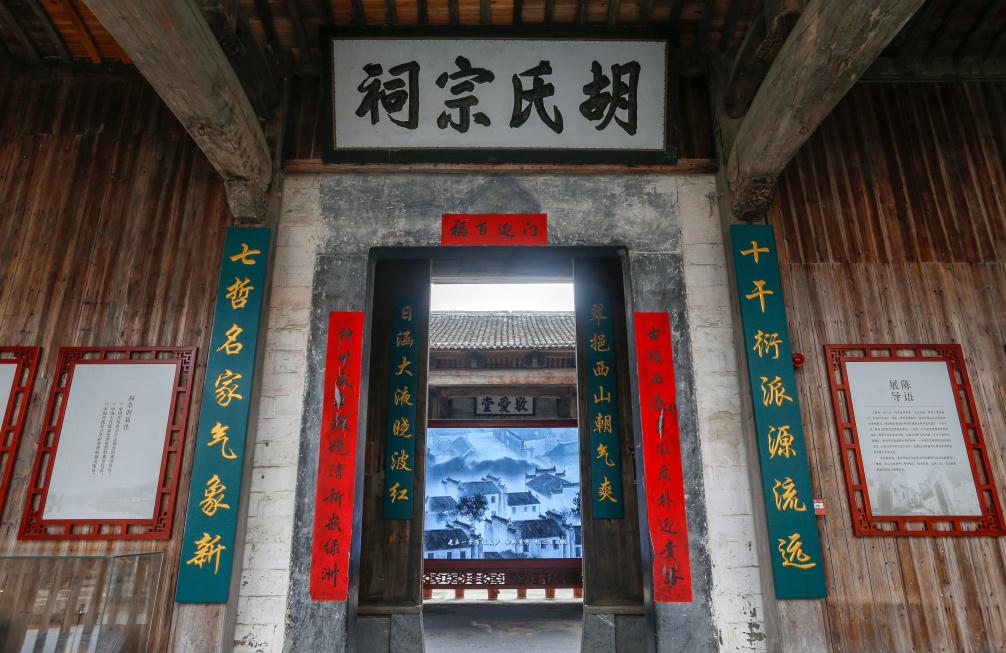 黄山市黟县西递村胡氏宗祠的牌匾和楹联(1月26日摄)。