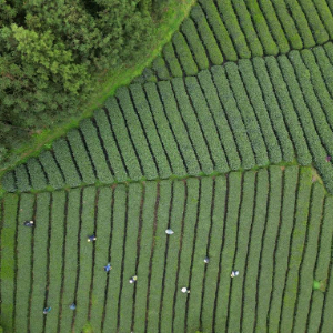 图为4月5日,村民在贵州省遵义市余庆县松烟镇二龙村茶场采摘春茶(无人机照片)。新华社发 贺春雨 摄