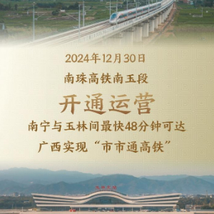 新华社北京12月30日电(记者樊曦、林凡诗)记者从中国国家铁路集团有限公司获悉,30日,南宁至珠海高铁南宁至玉林段(南珠高铁南玉段)开通运营,广西玉林迈入高铁时代,南宁与玉林间铁路最快旅行时间缩短至48分钟。至此,广西14个设区市全部实现“市市通高铁”。