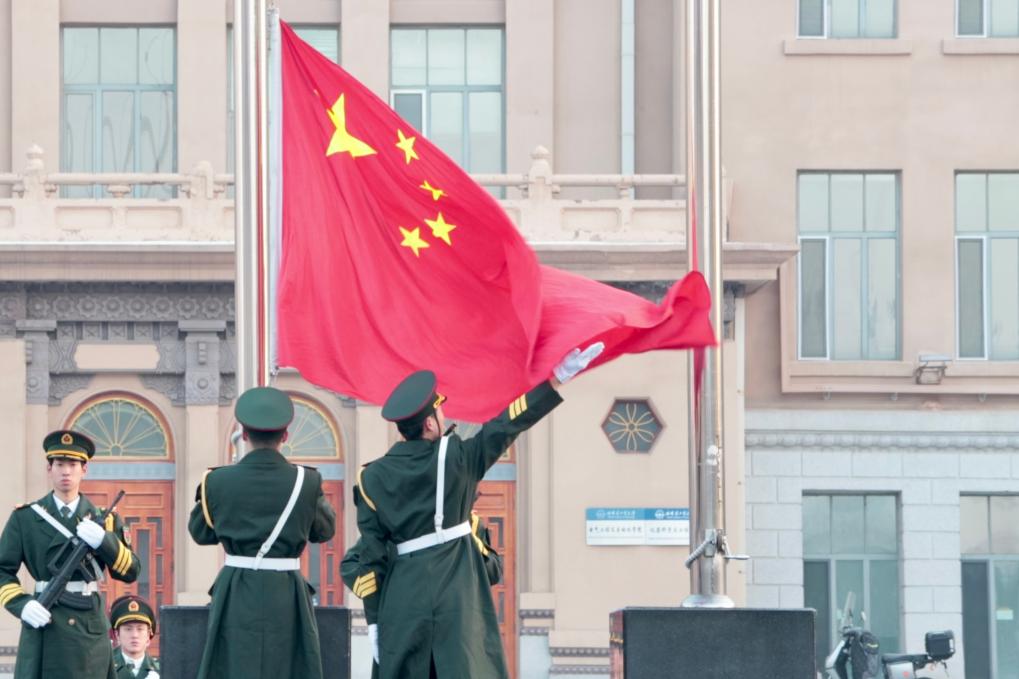 “起来!不愿做奴隶的人们!把我们的血肉,筑成我们新的长城……”五星红旗越升越高,迎风飘扬。在零下20多摄氏度的低温中,在场师生齐声高唱《义勇军进行曲》。