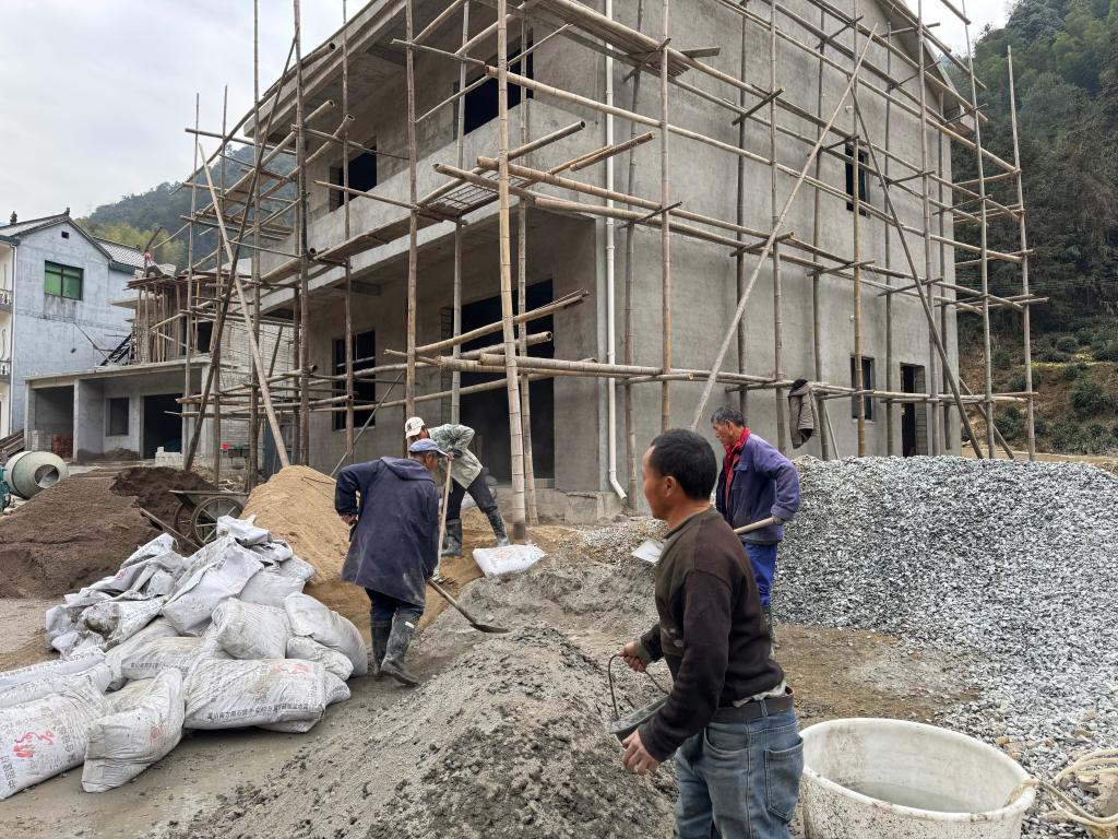 1月8日,在歙县绍濂乡岭口村,几位工人正在房屋恢复重建现场工作。新华社记者潘峰 摄