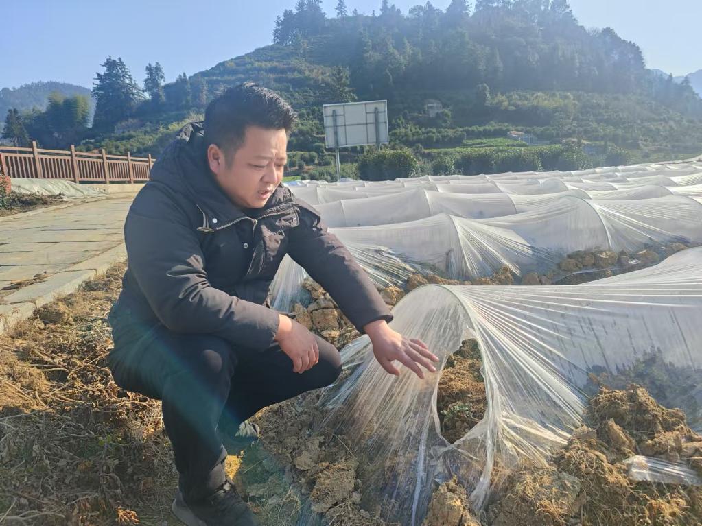 1月9日,歙县花辰尹家庭农场农场主张兴向记者介绍菊苗生长情况。新华社记者姜刚 摄