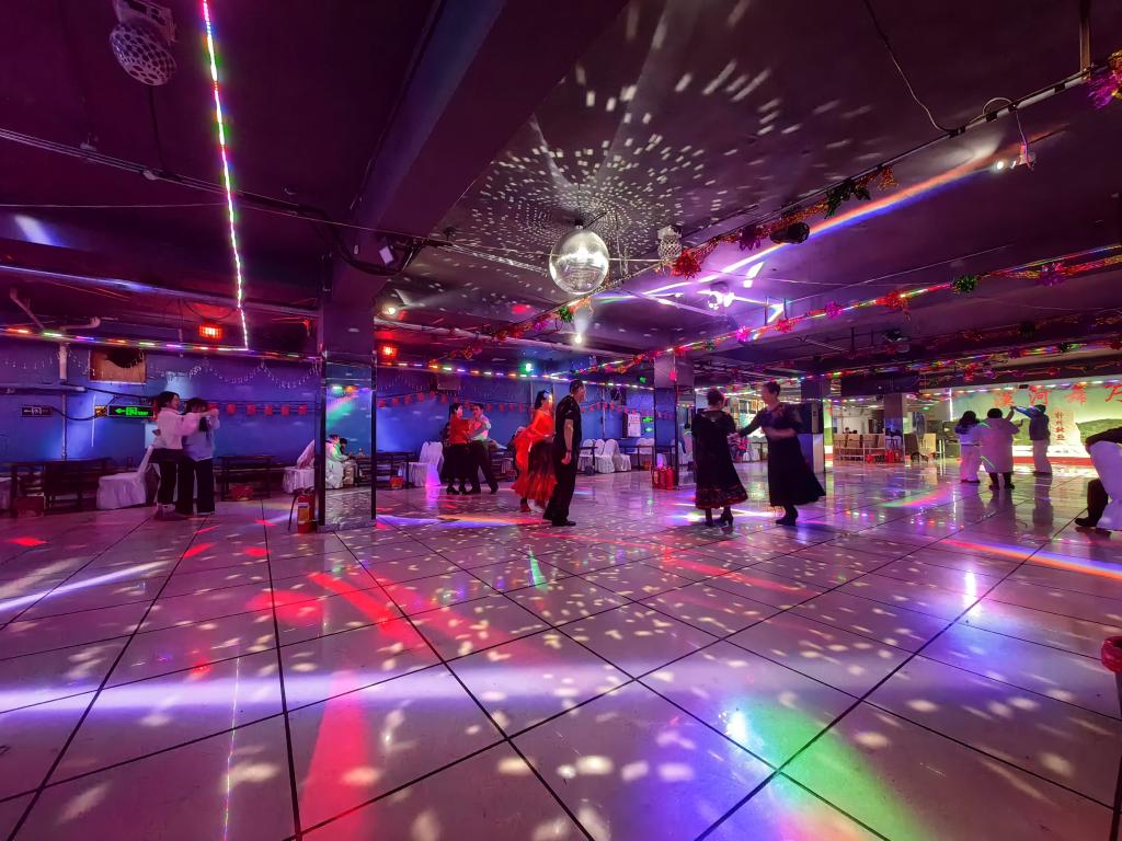 推门而入,仿佛踏进另一个世界——舞厅里是二十世纪八九十年代的装修风格,怀旧氛围扑面而来。在舞池中央,银色的宇宙球灯光闪烁,一对对舞者轻快地跳起交谊舞,时光仿若倒回。