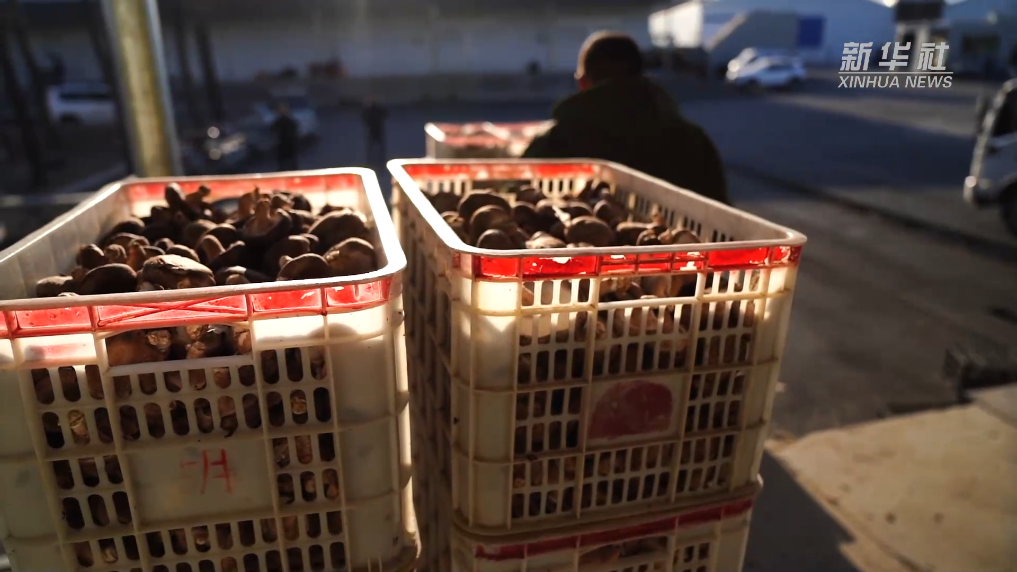 在阜平县平阳镇北水峪园区香菇种植基地,工人们正在大棚里采摘香菇。