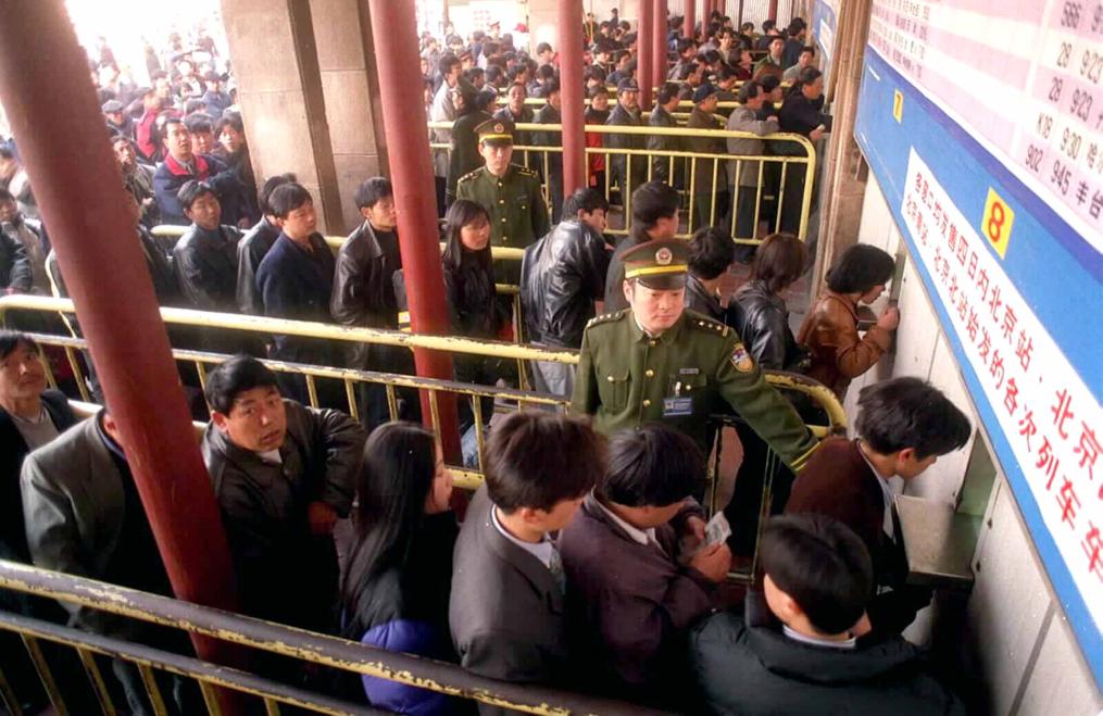 1994年1月30日,北京火车站春运工作进入第二个高峰,当日从北京站上车的旅客约有11万人。这是大批在京务工人员在站前广场排队等候上车。