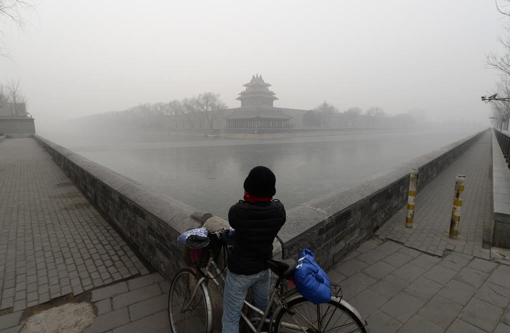 2015年12月25日,一名市民在拍摄笼罩在雾霾中的北京故宫角楼。新华社记者 武巍 摄