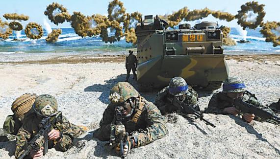 美韩士兵演练抢滩登陆。