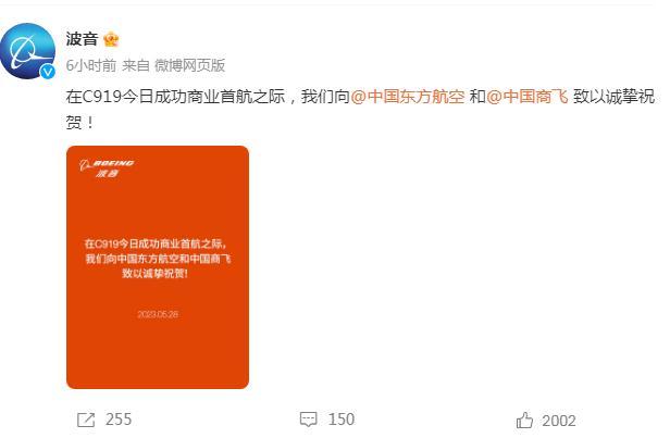 @波音:在C919今日成功商业首航之际,我们向@中国东方航空 和@中国商飞 致以诚挚祝贺!