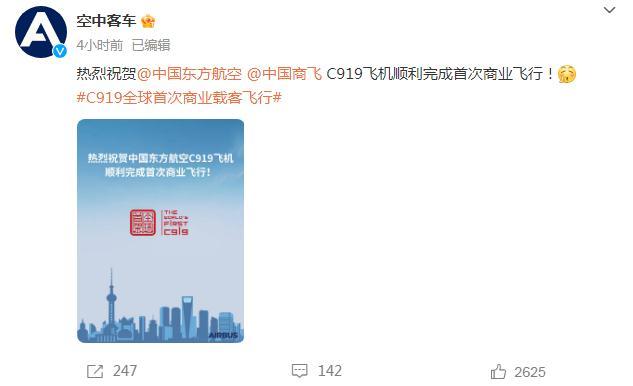 @空中客车:热烈祝贺@中国东方航空 @中国商飞 C919飞机顺利完成首次商业飞行!