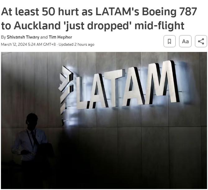 《新西兰先驱报》称,这架波音客机空中急降颠簸是因为“技术问题”。目前波音公司和拉塔姆航空公司方面都尚未对此作出回应。