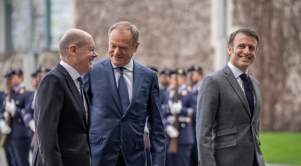 2024年3月15日,德国柏林,德国联邦总理朔尔茨(左)在总理府前会见法国总统马克龙(右)和波兰总理唐纳德·图斯克。(视觉中国)