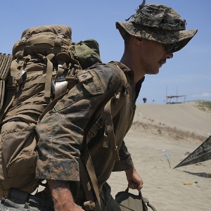 当地时间2024年5月8日,美菲“肩并肩”联合军演在菲律宾进行 ,一名身着战斗装备的士兵在联合军事演习中行走。(视觉中国)