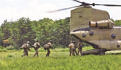 7月22日,参加美日联合军事演习的美陆军士兵登上CH-47运输直升机执行任务