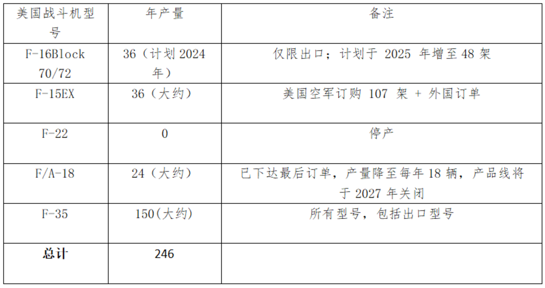 作为战斗机生产的强国,美国当前生产的4种战斗机分别为F-16“战隼”、F-15EX“攻击鹰”、F/A-18“超级大黄蜂”(及其“咆哮者”型号)和F-35“闪电II”。其中,F-16主要用于出口(美国空军已不再采购),而F-35则是为美军生产的主要机型。未来几年内,预计F-15EX和F/A-18的两条生产线将相继关闭,仅保留F-35的生产。