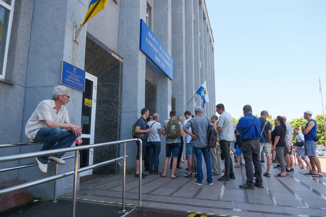 2024年7月12日,乌克兰基辅,乌克兰应征入伍的士兵在政务中心外排队等候办理手续。CNN报道配图