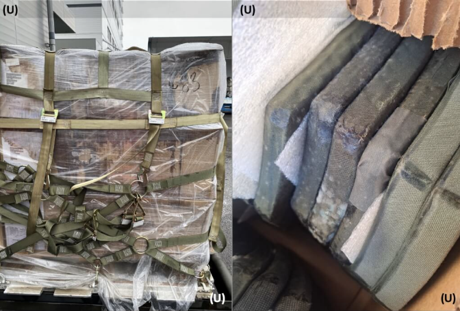 美国提供给台湾的军备从包装可看到潮湿发霉。图中物品包括防弹板,2023年12月底运到台湾。图自台湾“中央社”