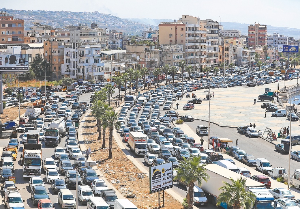 23日,因遭以色列空袭,黎巴嫩南部海港城市西顿的大批民众开车逃离家园。(新华视觉)