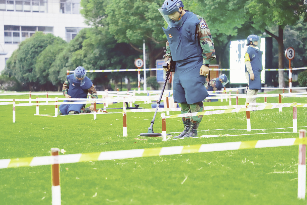 此次演练在该校信息化人道主义扫雷综合训练场上进行,这是一个非常现代化、智能化的数字化训练场。训练场由扫雷作业管理区、雷场作业训练区、未爆弹药处置训练区以及地雷探测训练区四大部分组成,功能划分清晰。