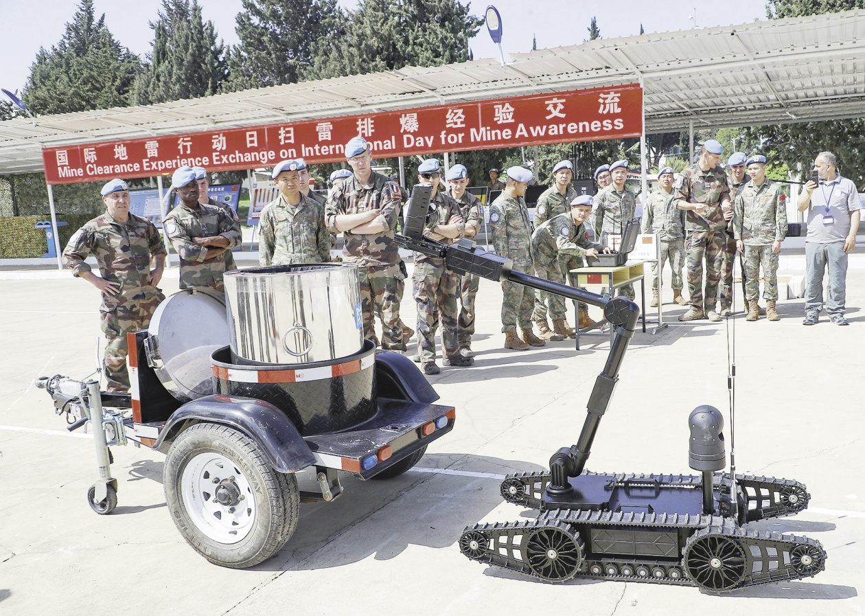 4月4日,中国第22批赴黎巴嫩维和部队多功能工兵分队与法国维和部队进行扫雷排爆经验交流。(视觉中国)
