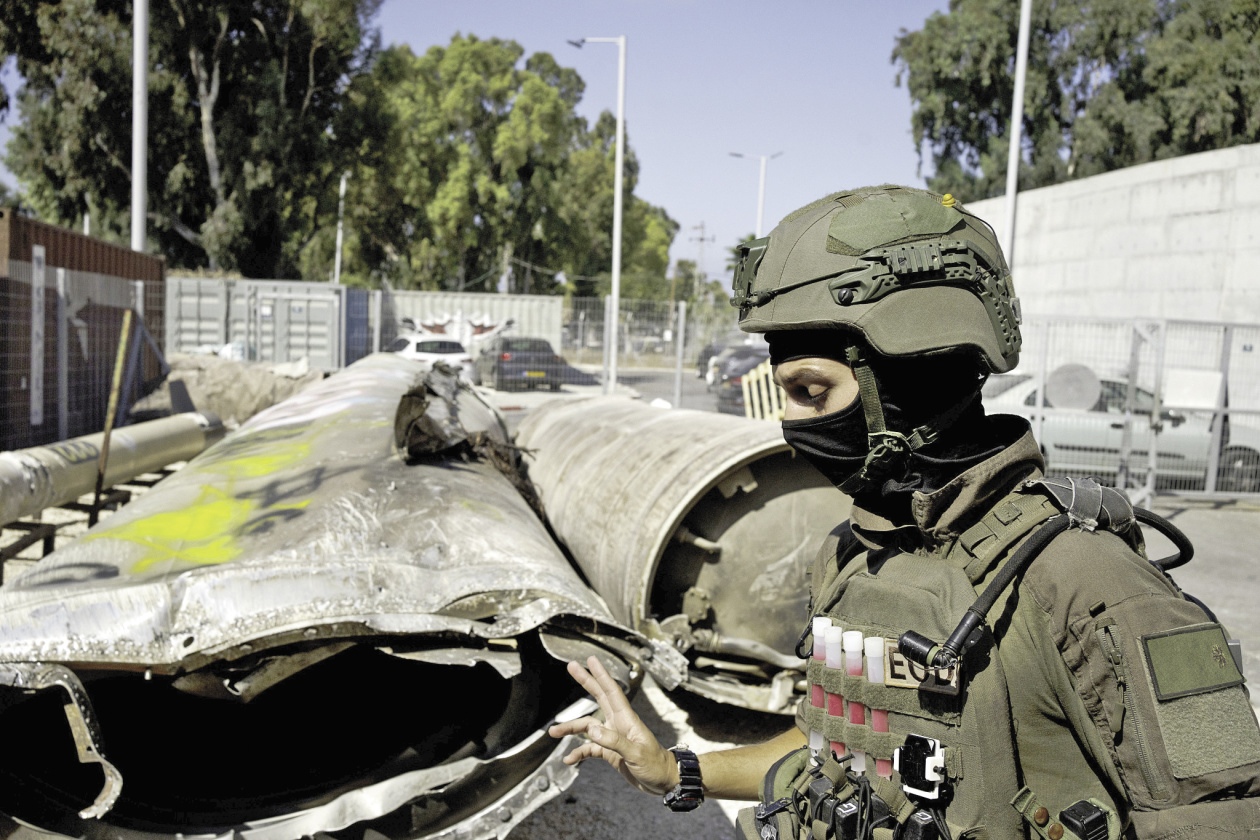 当地时间10月9日,以色列政府组织的媒体参观活动展示了伊朗向以色列发射的弹道导弹部件。(视觉中国)