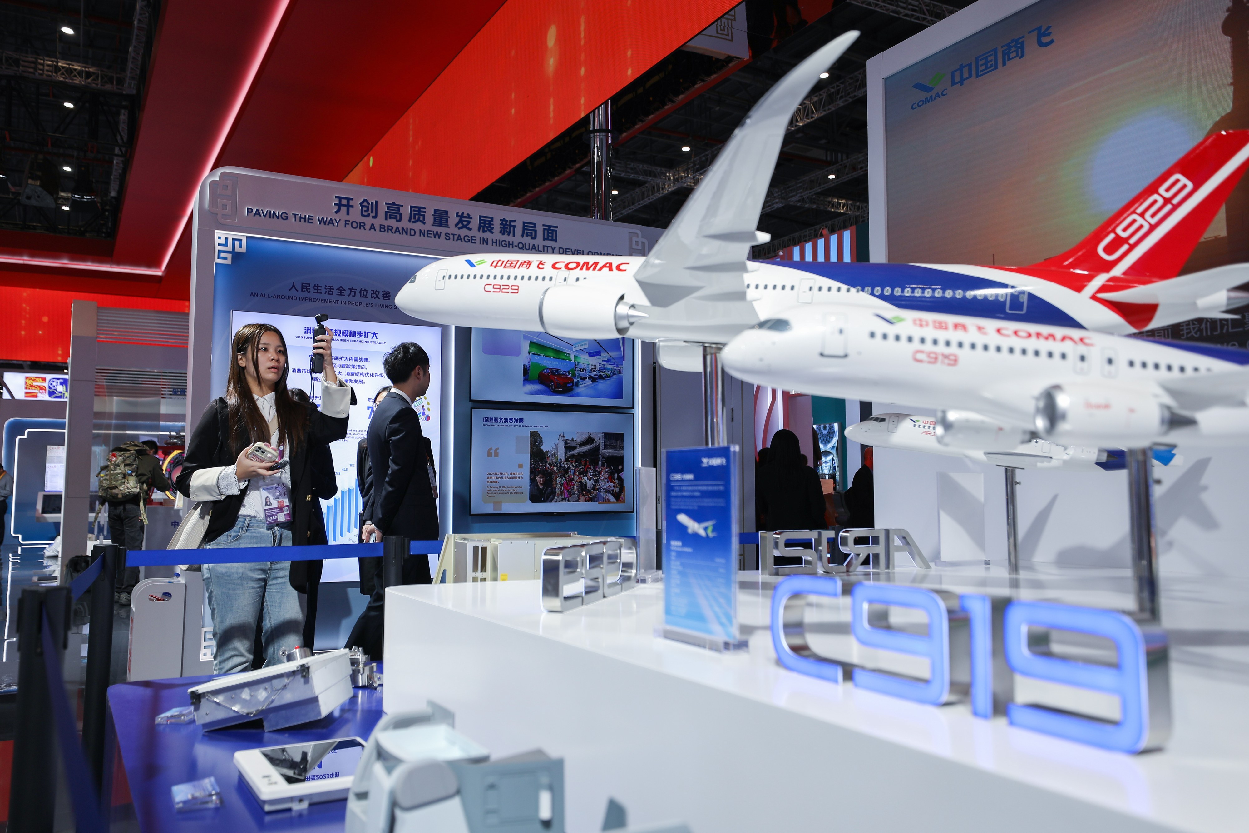 11月5日,参会者在中国馆拍摄中国商飞的飞机模型。(新华社)
