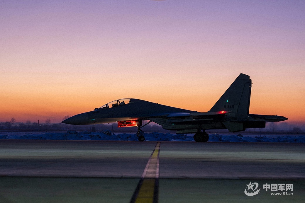 战机在暮色中滑向起飞线。