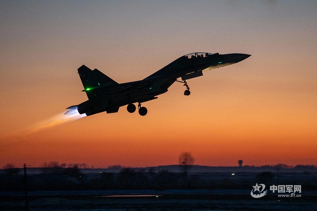 战机在暮色中加力升空。