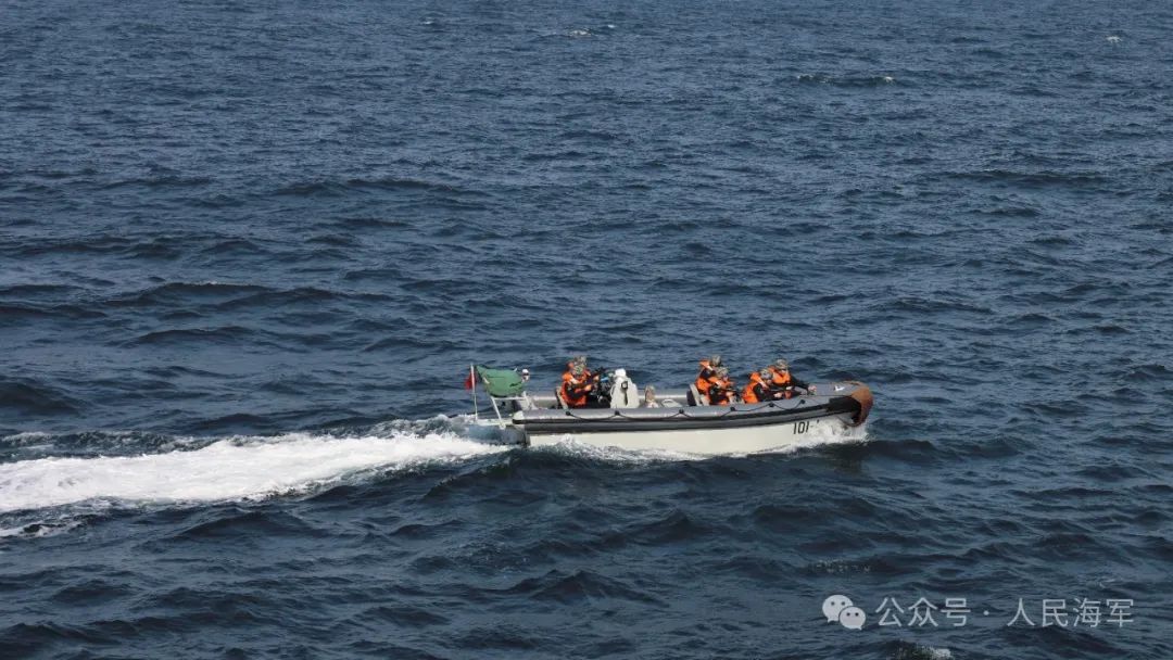 ▲官兵乘坐小艇执行任务归来